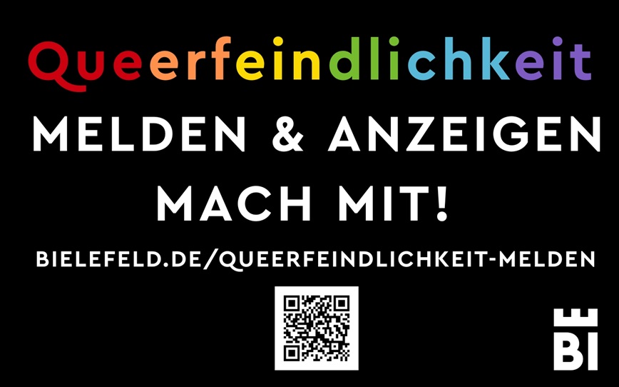 Queerfeindlichkeit melden & anzeigen – Mach mit!Die Gleichstellungsstelle der Stadt Bielefeld setzt sich für Vielfalt und Akzeptanz in der Stadt-Gesellschaft ein und startet eine Kampagne gegen Queerfeindlichkeit. Diese soll auf die Problematik der Diskriminierung und Gewalt gegen queere Menschen aufmerksam machen und Betroffene und Bürger*innen zu ermutigen, Vorfälle zu melden und anzuzeigen. Ziel der Kampagne ist, das Bewusstsein für Queerfeindlichkeit zu schärfen und eine solidarische Gemeinschaft zu fördern, die sich aktiv gegen Diskriminierung einsetzt und Diskriminierung und Gewalt sichtbar zu machen.